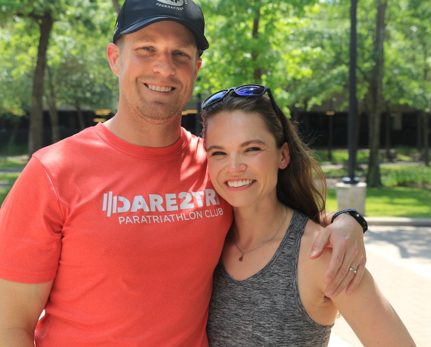 Scott Flathouse-K10A5886 Published May 24, 2018 at 4524 × 3648 in Ironman Texas 2018 – Guiding Randi Strunk Thanks to Scott Flathouse for this photo of me and James the day after IMTX. James is wearing a Dare2Tri shirt and has is arm around my shoulder.